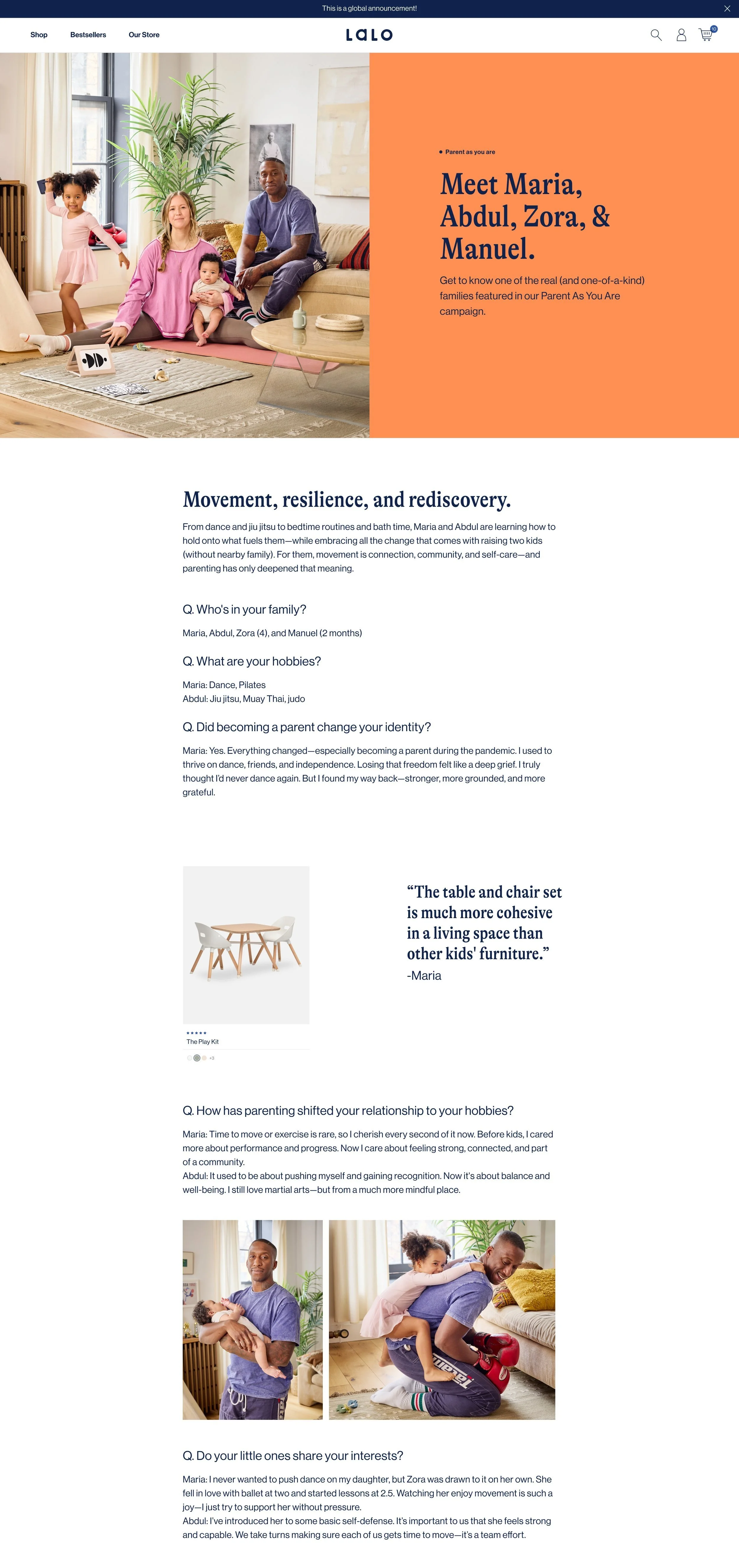 Four families, each with their own individual interests and passions, were shot at home as the anchor creative to this campaign. Their homes are distinctive, design forward, and full of personality that reflects their interests as people, not just as parents. Within each portrait, Lalo product is seamlessly integrated into their homes and their lives.